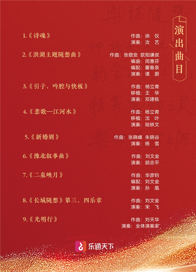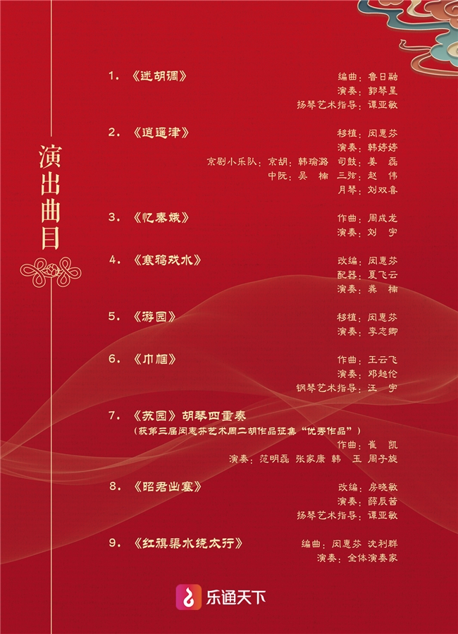 11月5日晚,第三届“闵惠芬艺术周”开幕式暨闵惠芬经典作品音乐会将在周口师范学院闵惠芬音乐厅举行,演出由无锡民族乐团协奏,孙鹏指挥,刘红主持,汝艺、谭蔚、邓建栋、陆轶文、杨雪、胡志平、孙凰、宋飞八位演奏家将奏响《诗魂》《洪湖主题随想曲》《引子、吟腔与快板》《悲歌-江河水》《新婚别》《豫北叙事曲》《二泉映月》《长城随想》《光明行》等闵惠芬先生演绎的经典曲目。(按出场顺序排列)