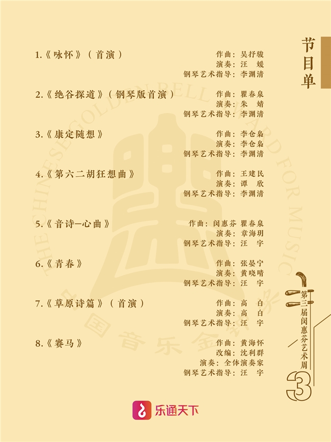 晚上,第三届“闵惠芬艺术周”闭幕式暨“金钟之星”二胡作品专场音乐会将在闵惠芬音乐厅举行,演出由闫晓宇主持,李渊清、汪宇担任艺术指导。金钟奖获得者汪媛、朱婧、李仓枭、谭欣、章海玥、黄晓晴、高白将倾情呈现《咏怀》《绝谷探道》《康定随想》《六狂》《音诗-心曲》《青春》《草原诗篇》七部作品(按出场顺序排列),其中《咏怀》为本届艺术周征集佳作,《草原诗篇》为首演、《绝谷探道》为钢琴版首演。最后,全体演员奏响闵惠芬先生演绎的经典曲目《赛马》。